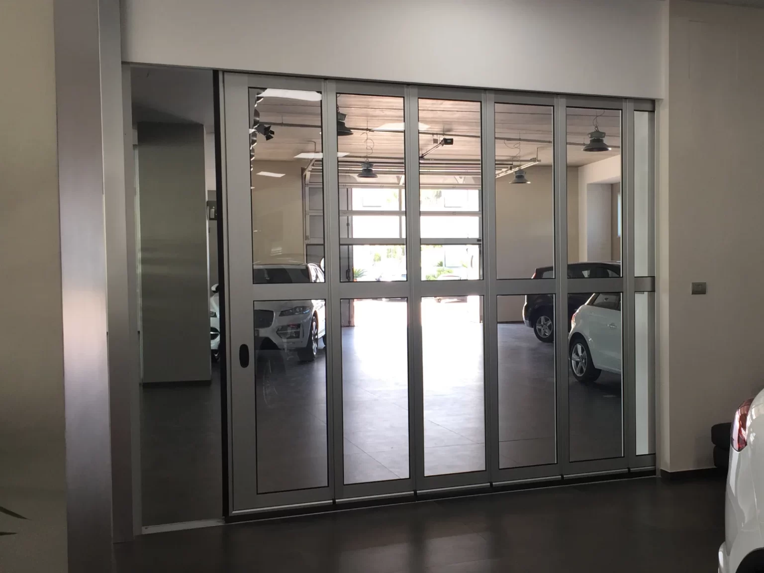 Questo consente di ottenere un effetto estetico pulito e mimale anche sul lato interno del portone, permettendo, al contempo, lo spegnimento automatico della luce in fase di sollevamento o discesa dei pannelli.